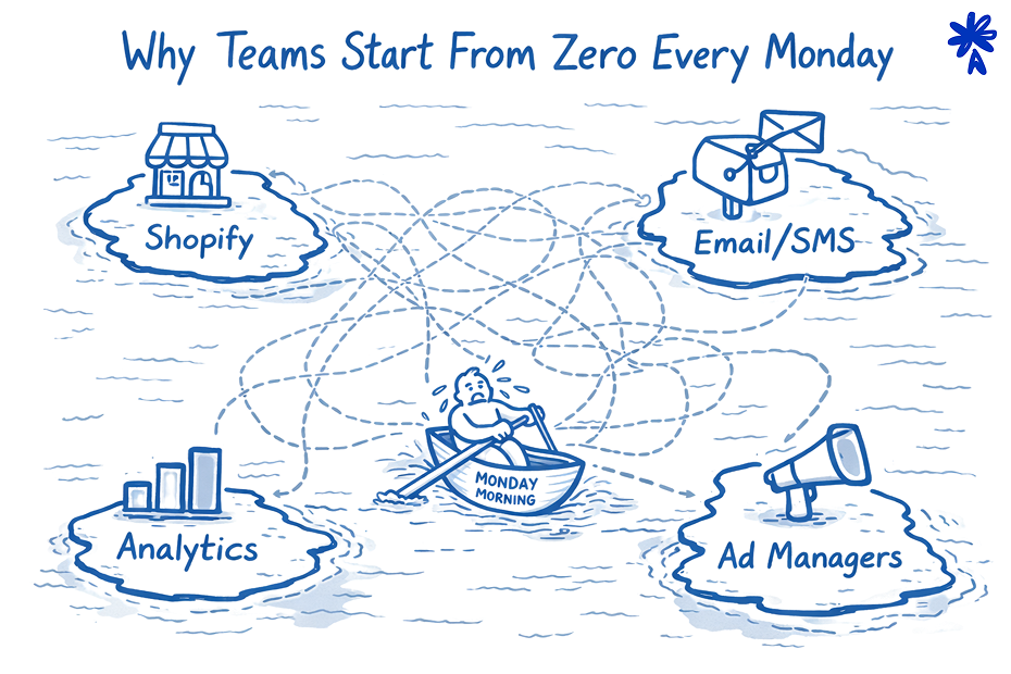 Monday starts with dashboards. Revenue, ROAS, CAC, conversion rate. Data is pulled from multiple tools and reconciled manually. The team discusses what happened last week and why.
